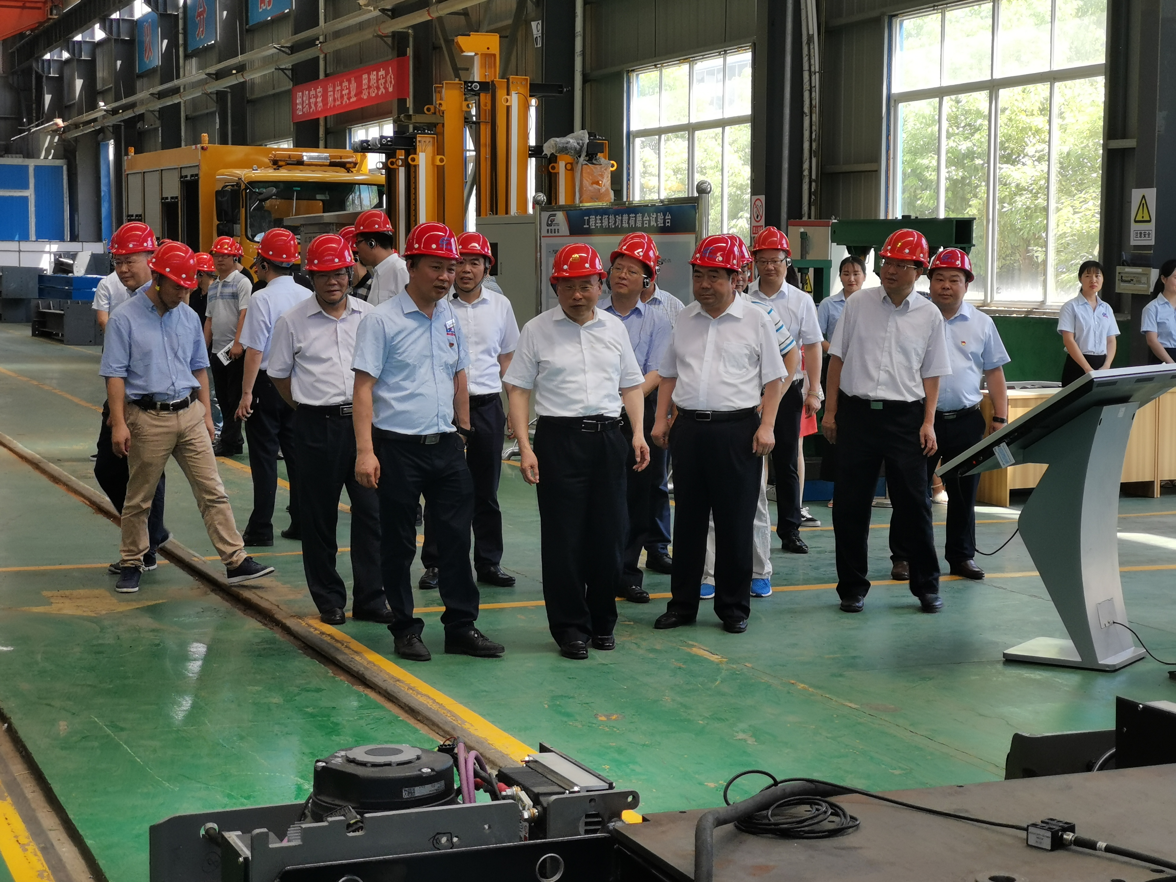 張清杰校長(zhǎng)、李德璋副市長(zhǎng)等一行走出展廳步入生產(chǎn)車間,邊走邊看,不時(shí)詢問生產(chǎn)操作人員和技術(shù)人員,在新產(chǎn)品研發(fā)車間參觀了“輪對(duì)、受電弓在線激光檢測(cè)系統(tǒng)”、“公鐵兩用車”等創(chuàng)新產(chǎn)品。